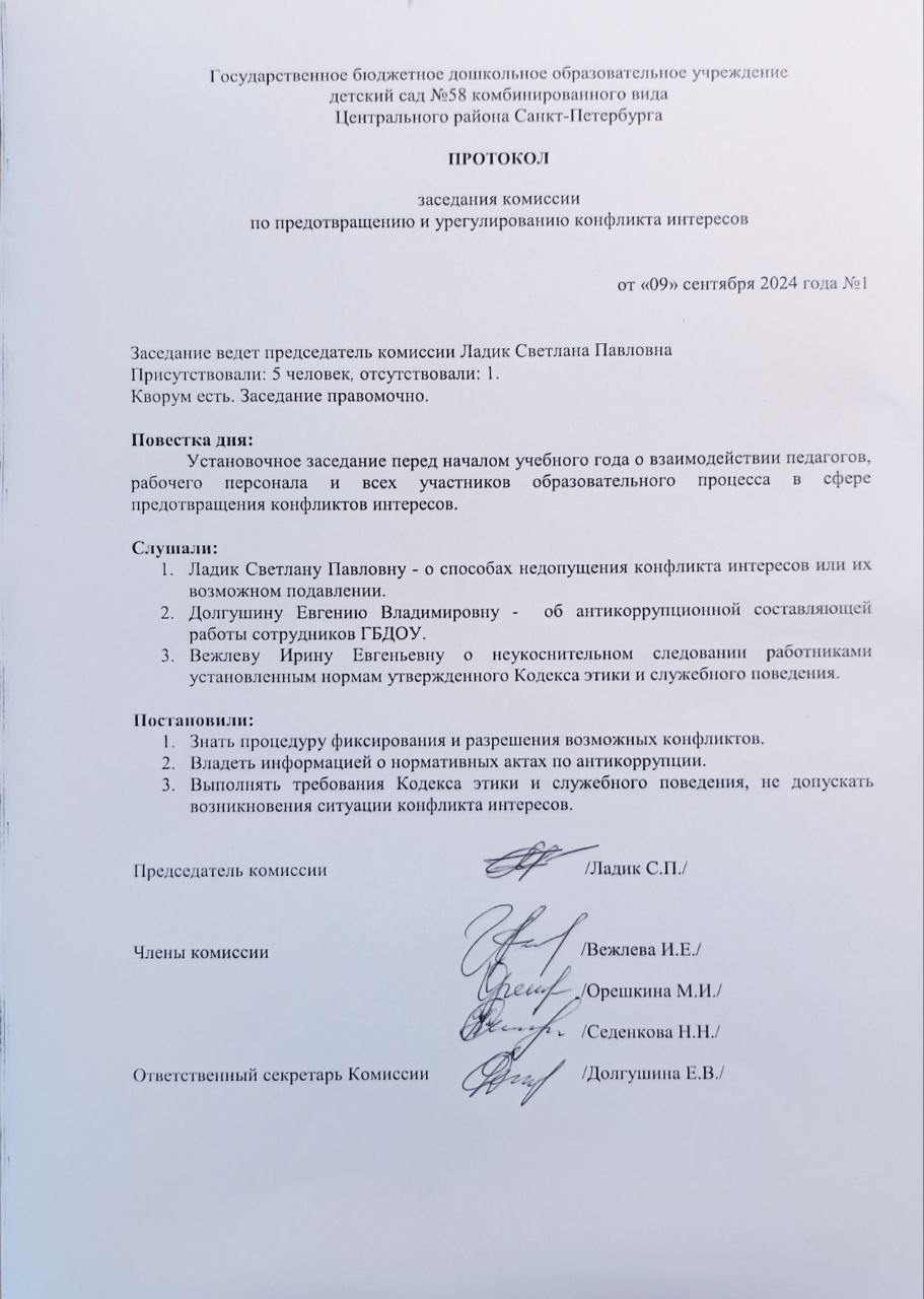 - заседание Комиссии по предотвращению и урегулированию конфликта интересов от 09.09.2024